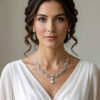 Víztiszta kristályokkal és gyöngyökkel kirakott ékszerszett, ezüst színű foglalatban.